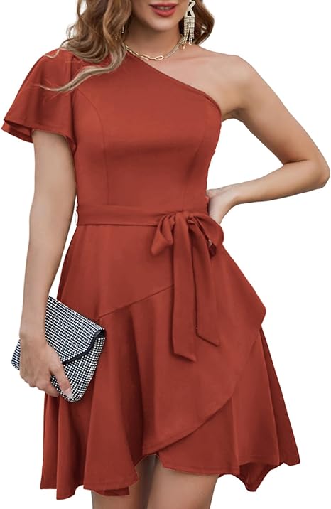 【Fashion Style】The one shoulder cocktail dresses show your elegance and sophistication. The sleeveless one shoulder dress greatly shows your pretty shoulder and reveals your delicate collarbone. Unique wrap front and ruffle hem design give you an elegant and charming look.
